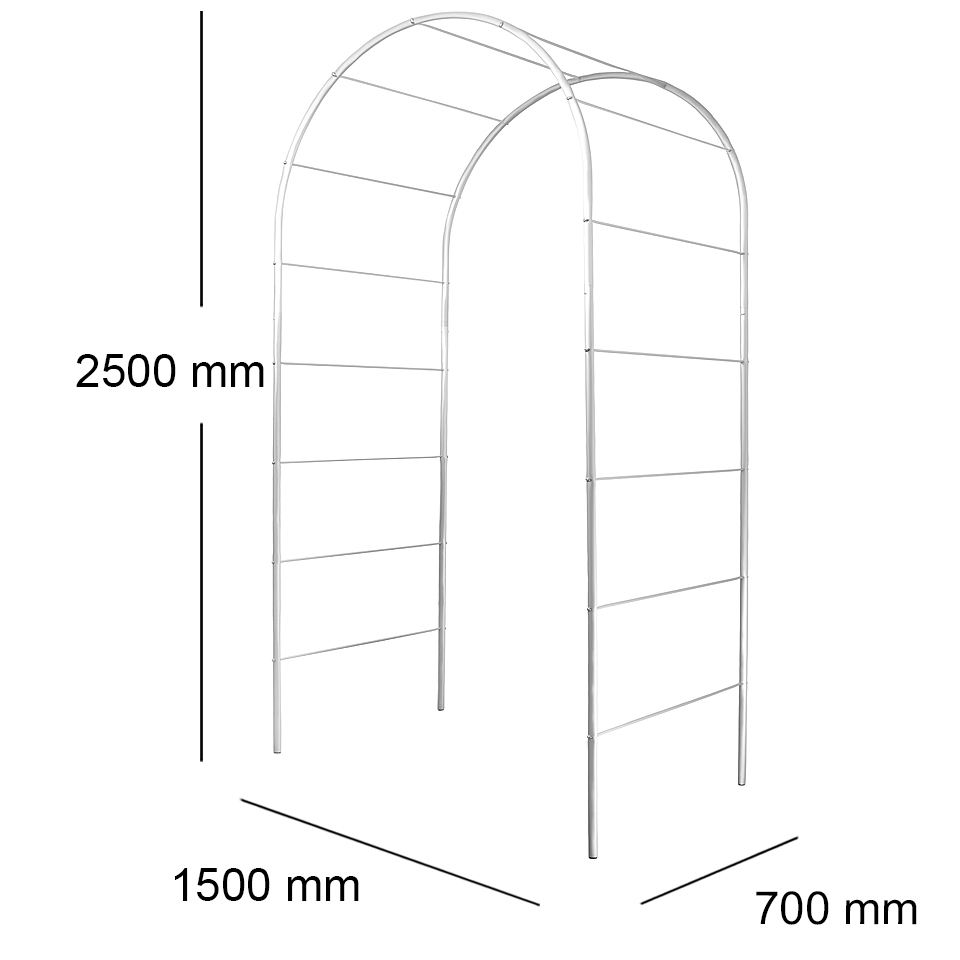 Арка садовая D20/D8-2500*1500*700 — универсальная конструкция для компактного размещения растений на приусадебном участке. Несущий профиль — труба круглая диаметром 20 мм, профиль обвязки — труба круглая диаметром 8 мм. Высота конструкции в собранном виде - 2500 мм; высота арочного элемента — 950 мм; высота стоек — 1550 мм; длина стяжек — 700 мм. Шаг между стяжками — 360 мм. Арочные дуги, стойки и стяжки — цельные, неразъемные.