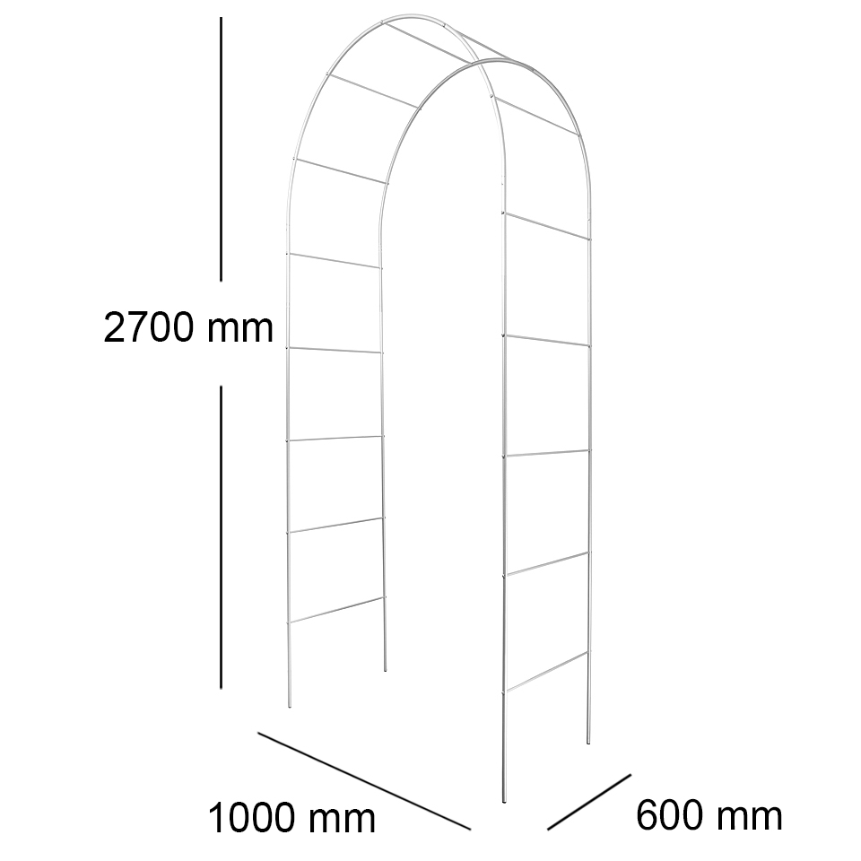 Арка садовая D16/D8-2700*1000*600 — универсальная конструкция для компактного размещения растений на приусадебном участке. Несущий профиль — труба круглая диаметром 16 мм, профиль обвязки — труба круглая диаметром 8 мм. Высота конструкции в собранном виде - 2700 мм; высота арочного элемента — 700 мм; высота стоек — 2000 мм; длина стяжек — 600 мм. Шаг между стяжками — 360 мм. Арочные дуги, стойки и стяжки — цельные, неразъемные.